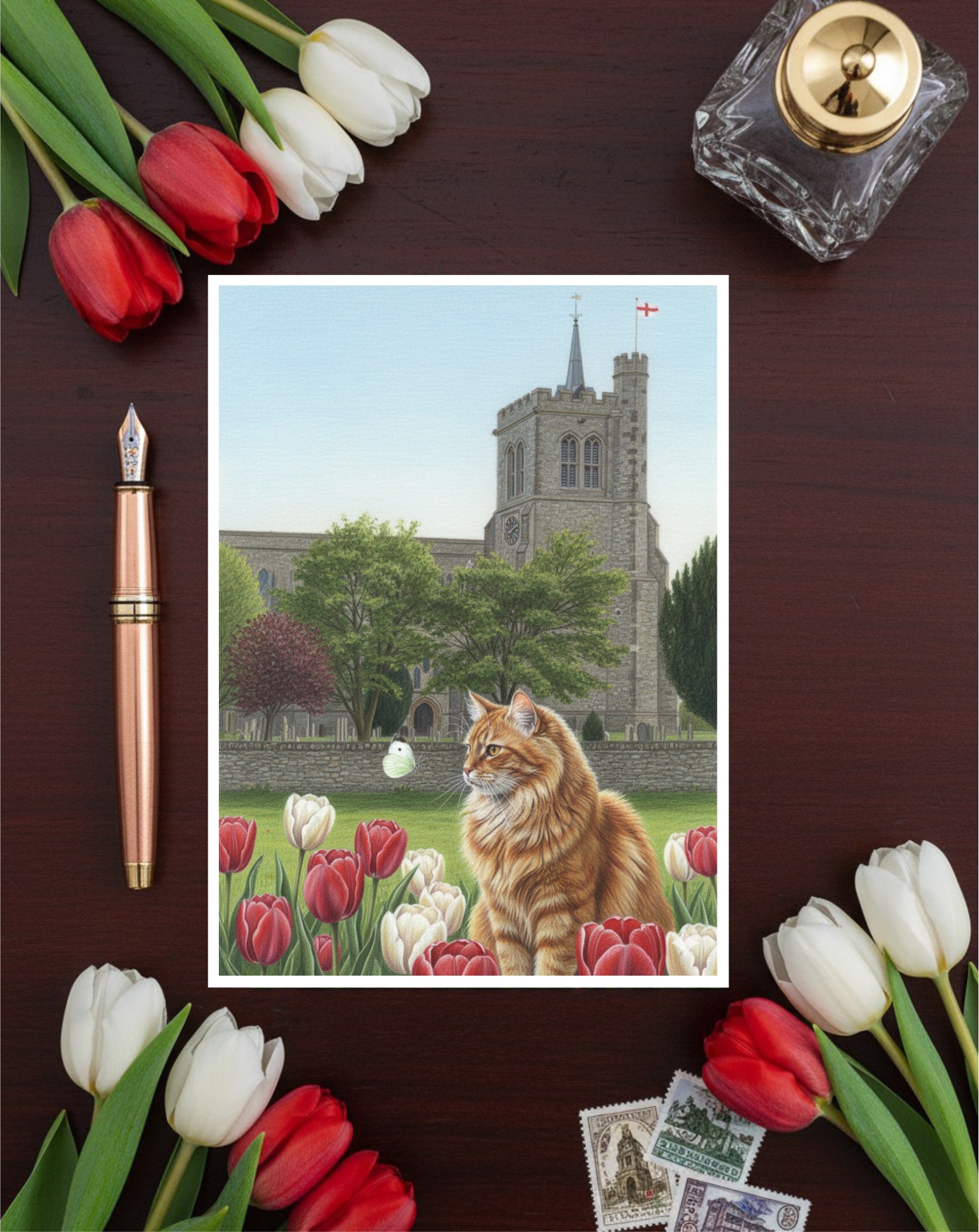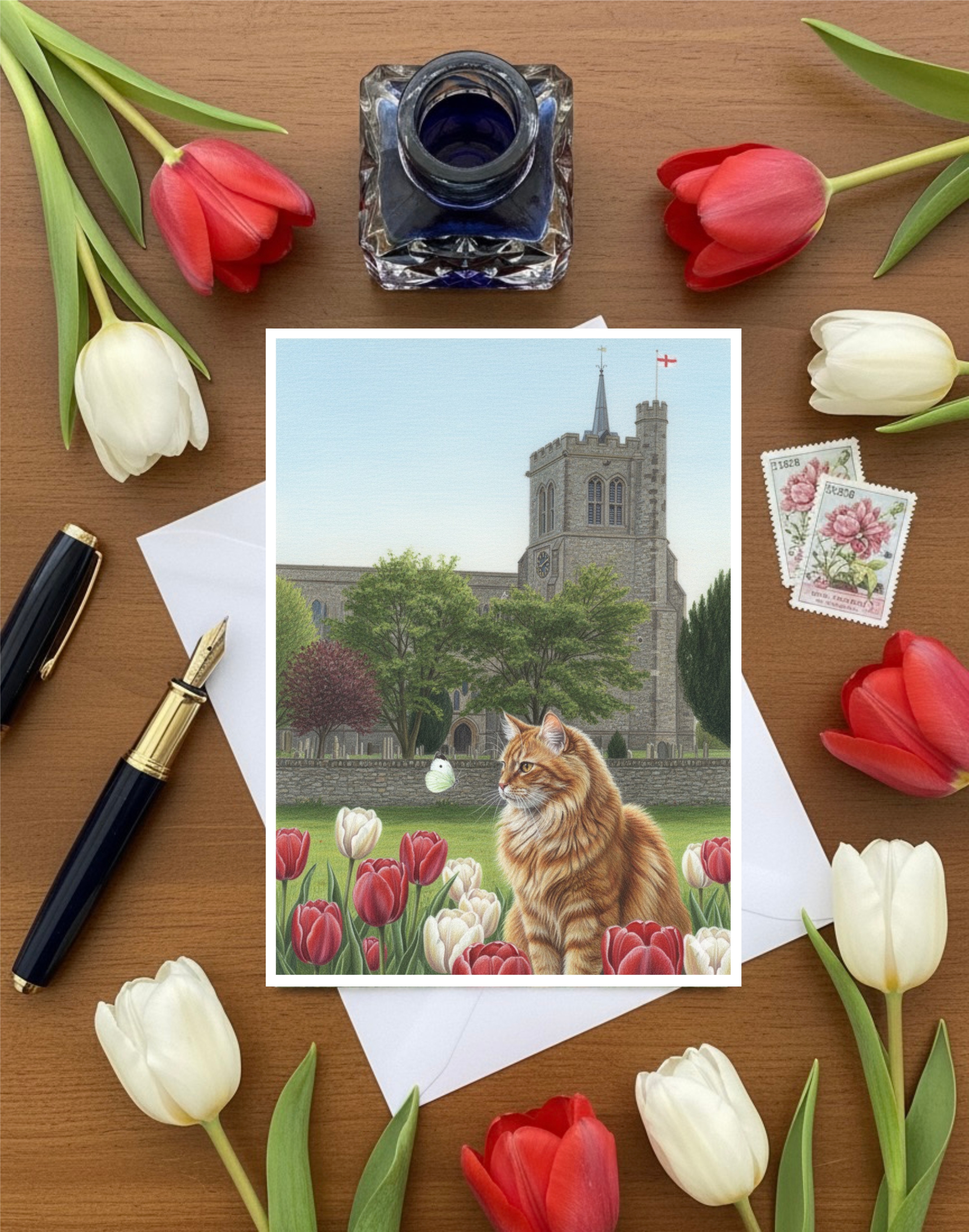 Elstow Abbey From The Distance, Elstow Green In Bedfordshire Greetings Card With Cat Detailed