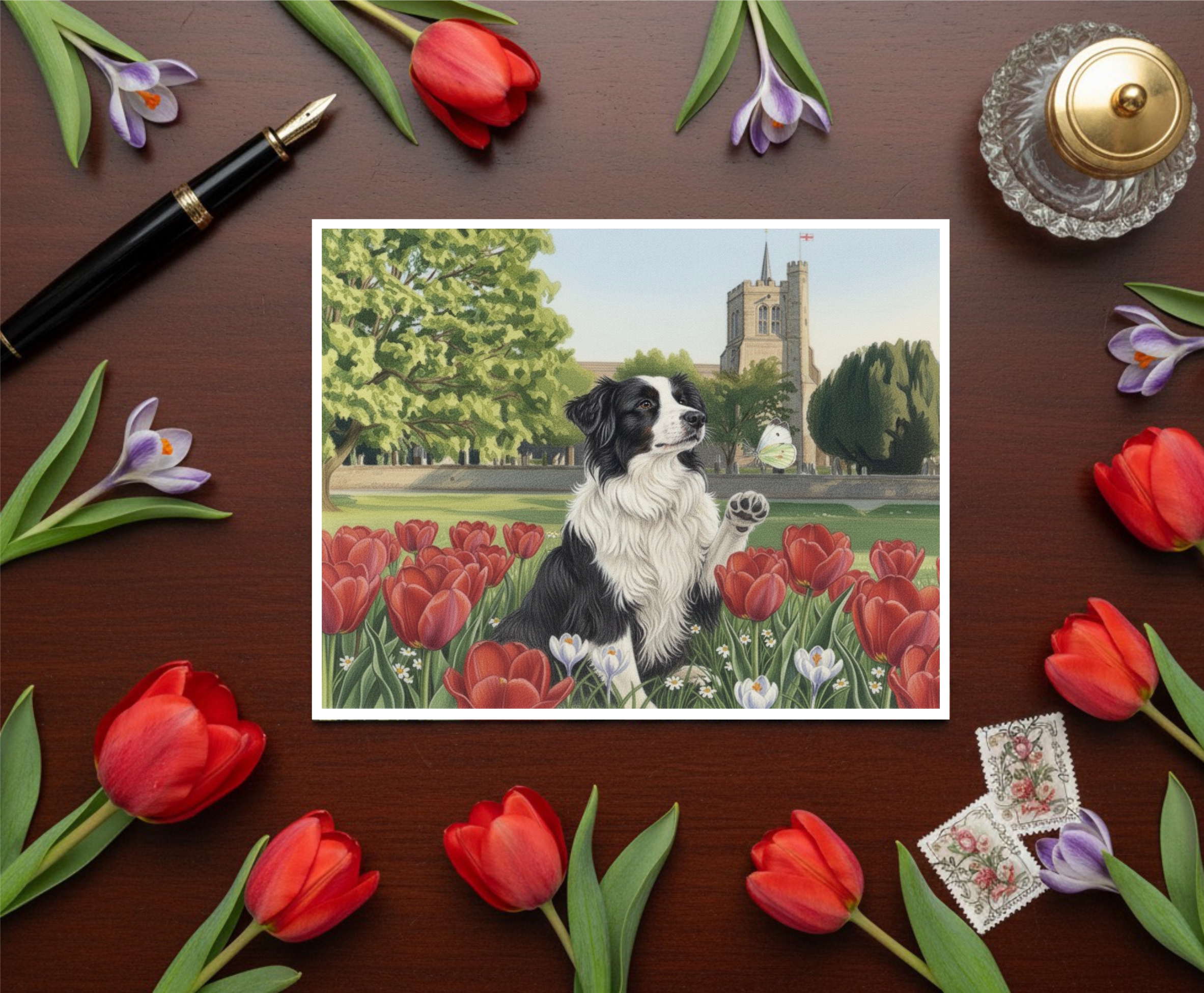 Elstow Abbey From The Distance, Elstow Green In Bedfordshire Greetings Card With Dog Playing With Butterfly