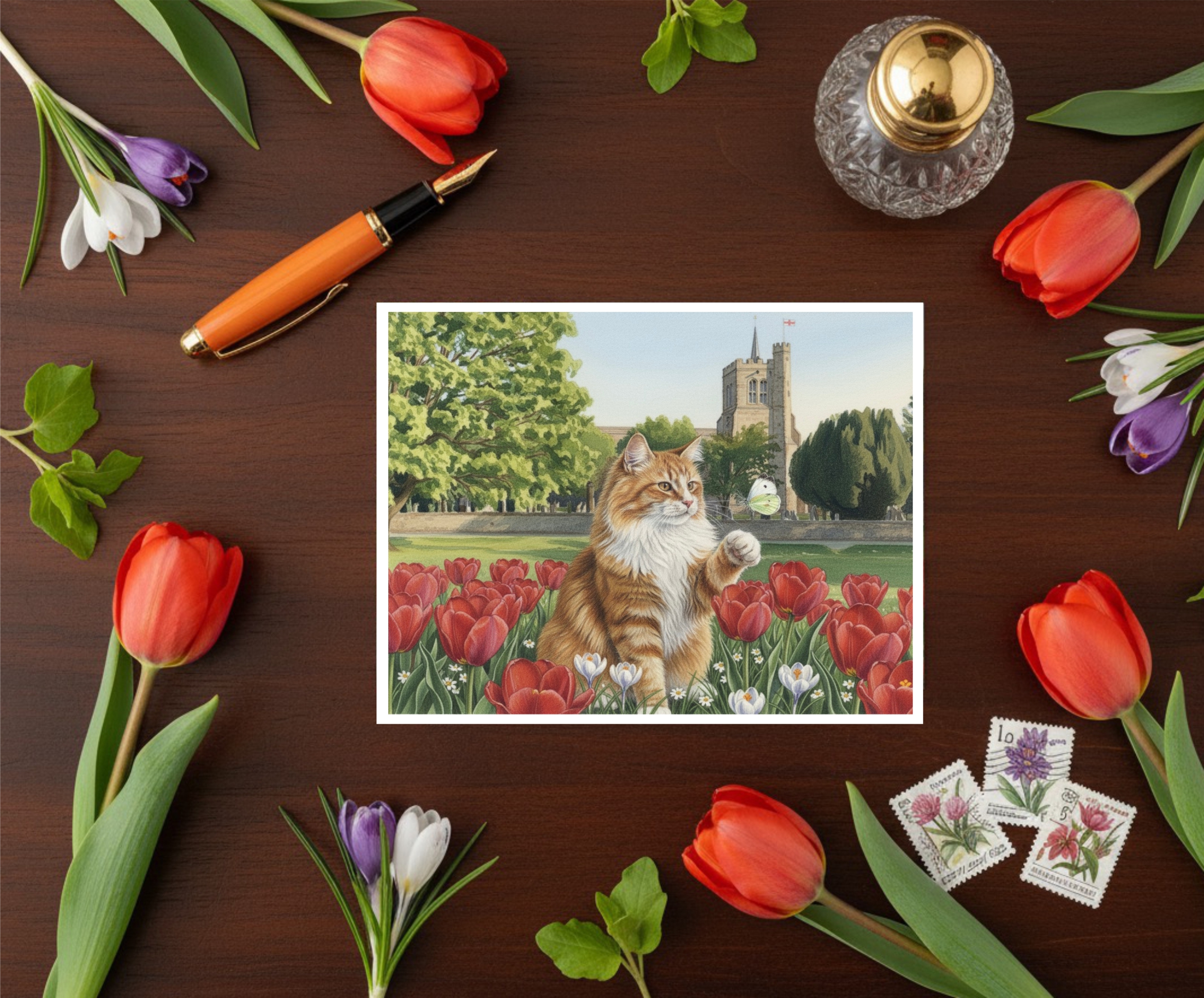 Elstow Abbey From The Distance, Elstow Green In Bedfordshire Greetings Card With Ginger Cat