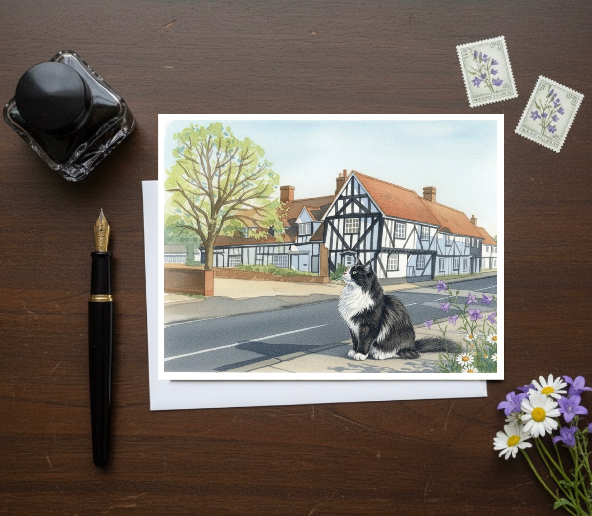 Elstow High Street Near Bedford In Bedfordshire Greetings Card Cat Version A beautiful  Art Card celebrating Elstow Village, near Bedford in Bedfordshire. This card features watercolour style artwork set against the village’s rich heritage. This range of cards celebrates both the iconic Christian landmarks—like Elstow Abbey and the site of John Bunyan’s life and work—and the peaceful English countryside that surrounds…