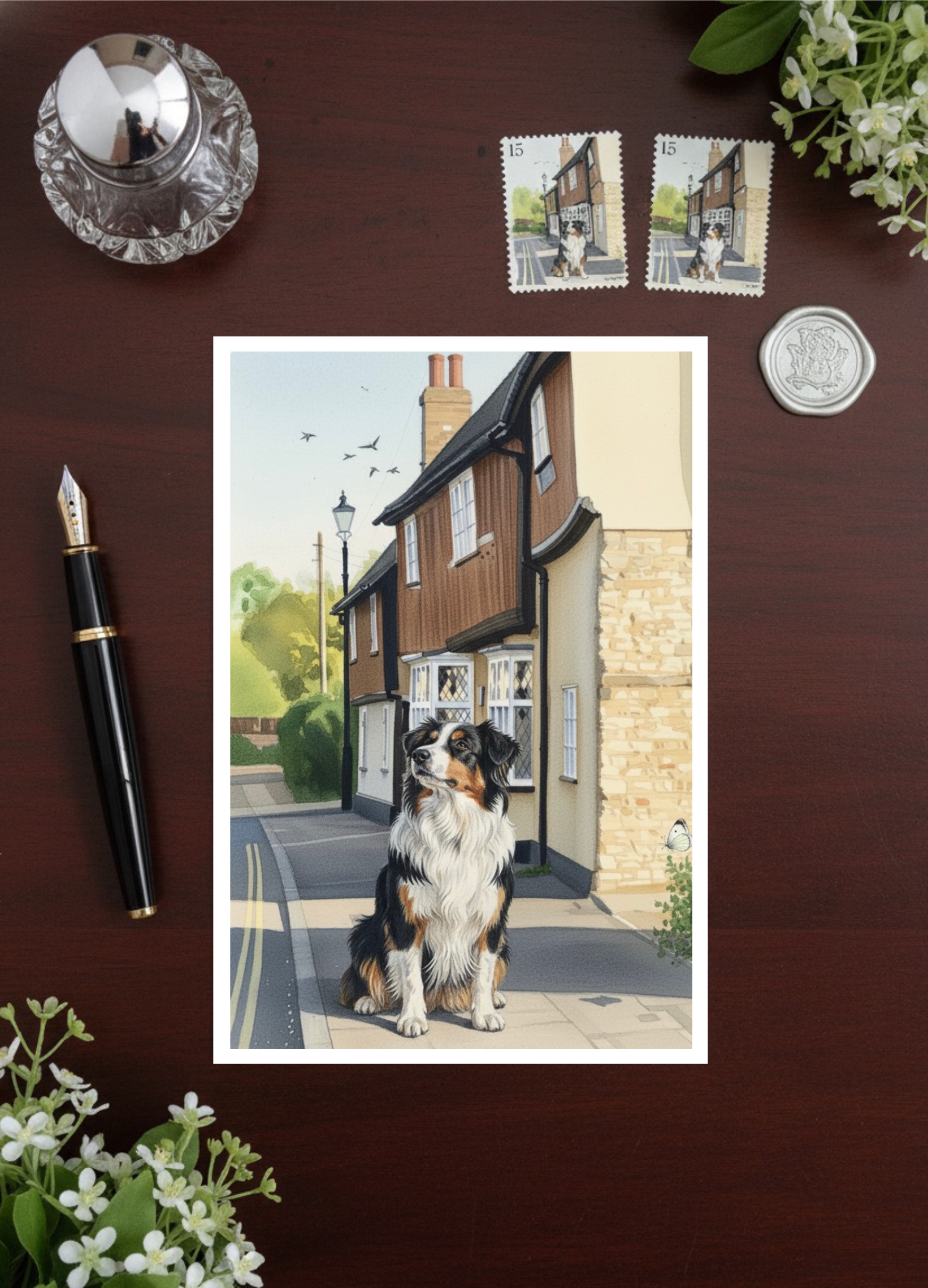 Elstow High Street, Old Swan Inn Near Bedford In Bedfordshire Greetings Card Dog Version A beautiful  Art Card celebrating Elstow Village, near Bedford in Bedfordshire. This card features watercolour style artwork set against the village’s rich heritage. This range of cards celebrates both the iconic Christian landmarks—like Elstow Abbey and the site of John Bunyan’s life and work—and the…