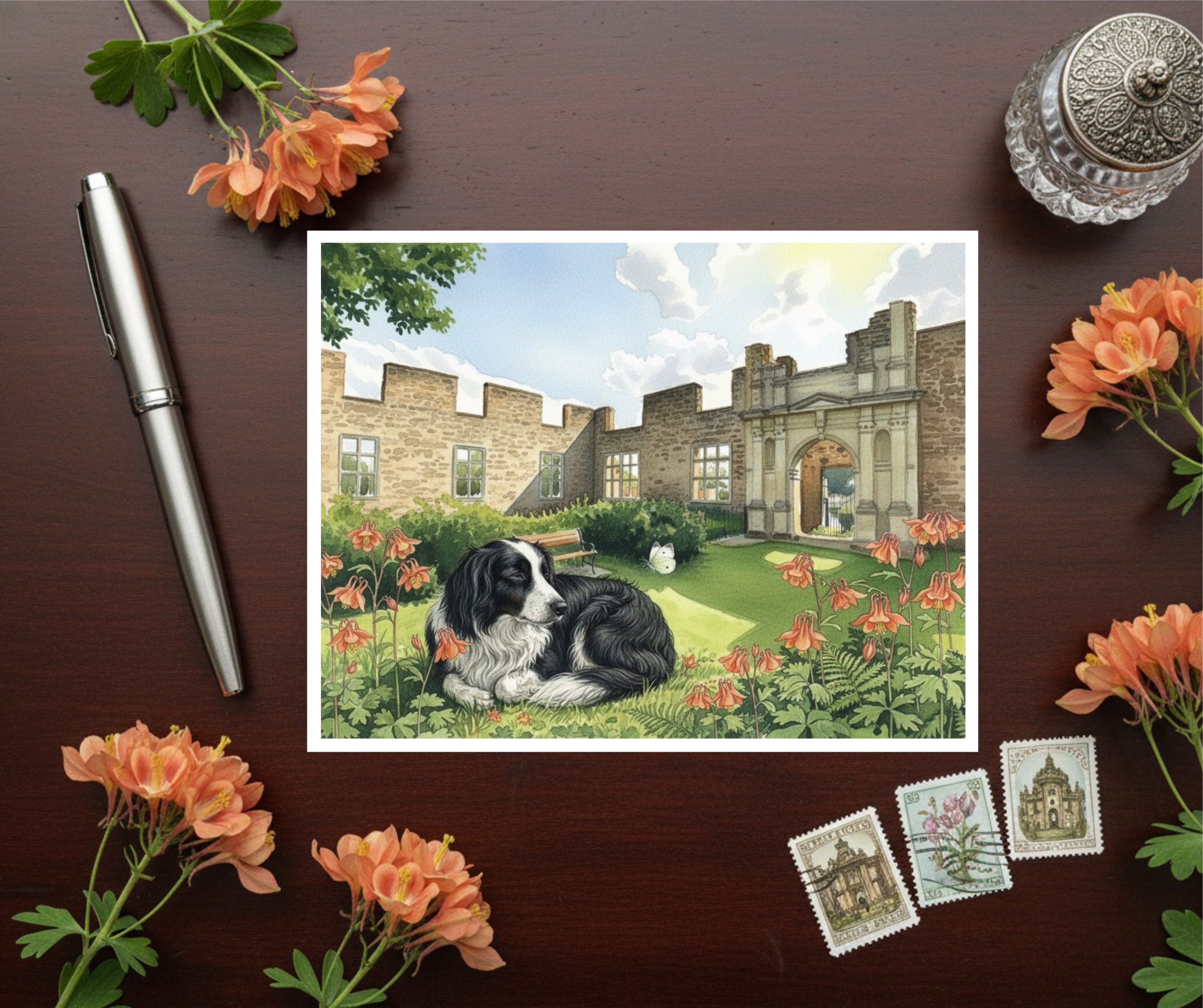 Elstow Hillersdon House Near Bedford In Bedfordshire Greetings Card With Dog A beautiful  Art Card celebrating Elstow Village, near Bedford in Bedfordshire. This card features watercolour style artwork set against the village’s rich heritage. This range of cards celebrates both the iconic Christian landmarks—like Elstow Abbey and the site of John Bunyan’s life and work—and the peaceful English countryside that surrounds…
